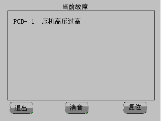 正常情況下“故障查詢”按鍵隱藏,當出現新故障時,運行主接口“故障查詢”按鍵閃爍并報警,按“故障查詢”鍵后進入故障查詢界面,如上圖4-10所示。在故障查詢界面按“消音”鍵停止報警,確認故障排除后可按“復位”鍵使機組復位。